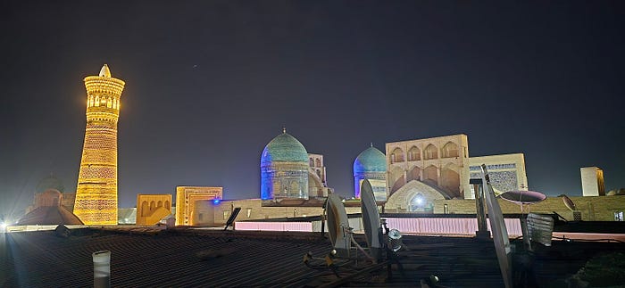 Otelimiz tam İpek Yolu üzerinde, Buhara’nın kalbinde ve her yere yürüme mesafesinde olan Ömer Hayyam Oteli. Yemek öncesi yarın ziyaret edeceğimiz Kalon Camii’nin gece halini görmek için kısa bir yürüyüş yapıyoruz. Köşeyi dönünce birdenbire karşımızda beliren görüntü son derece büyüleyici.